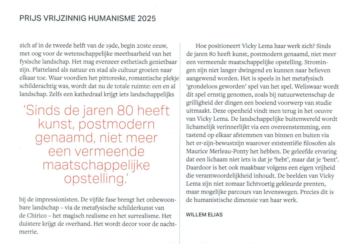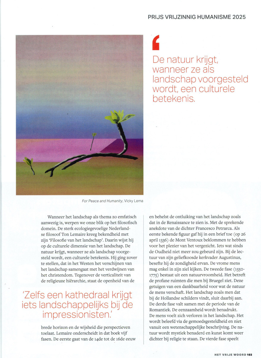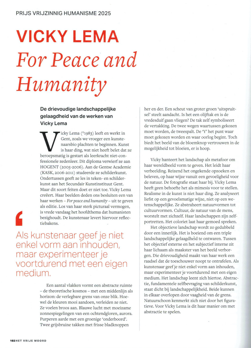 Publication in Het Vrije Woord, Magazine for free thinkers. Special Edition for the Price Liberal Humanisme 2025. Pages 102 - 104 'Vicky Lema, For Peace and Humanity'. Tekst by Willem Elias.